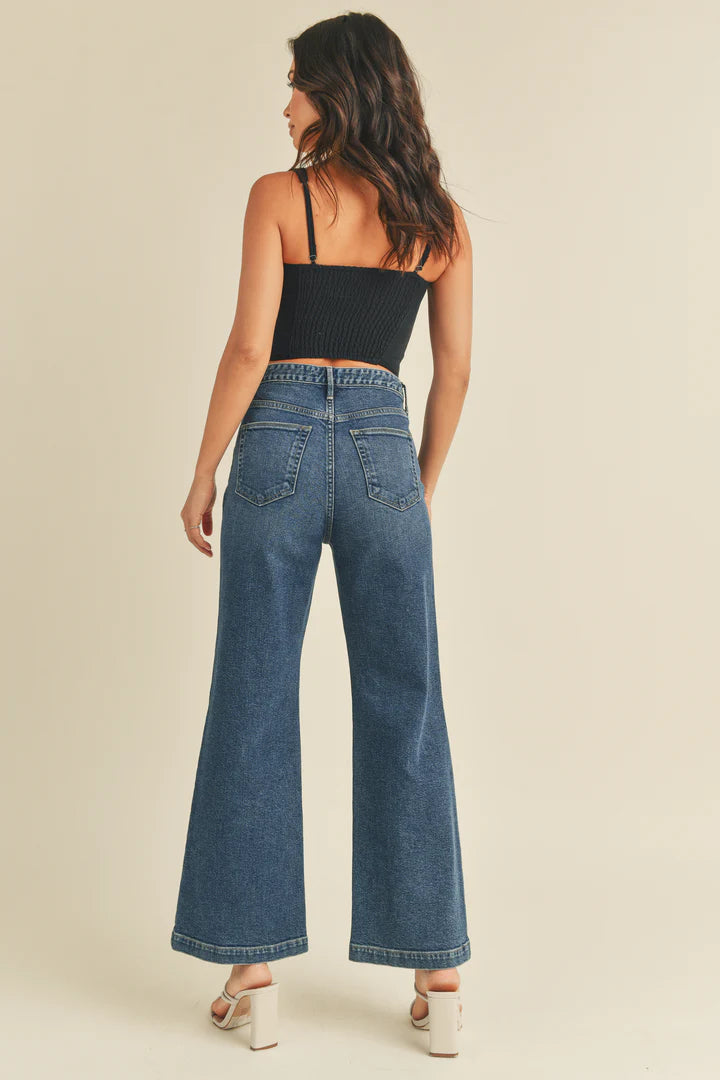 A trendy wide-leg jean with front patch pockets. With a high-rise waist and subtle flare through the leg, this wardrobe staple will take you through sandal season and back to boots in the fall without missing a beat.