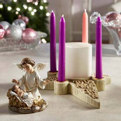 Thoughtfully designed and beautifully crafted, this Resin Nativity Angel Advent Candleholder features a star-shaped base complete with 4 candle holders, uniquely styled phrases and a cut-out center for the figurine to be placed in.