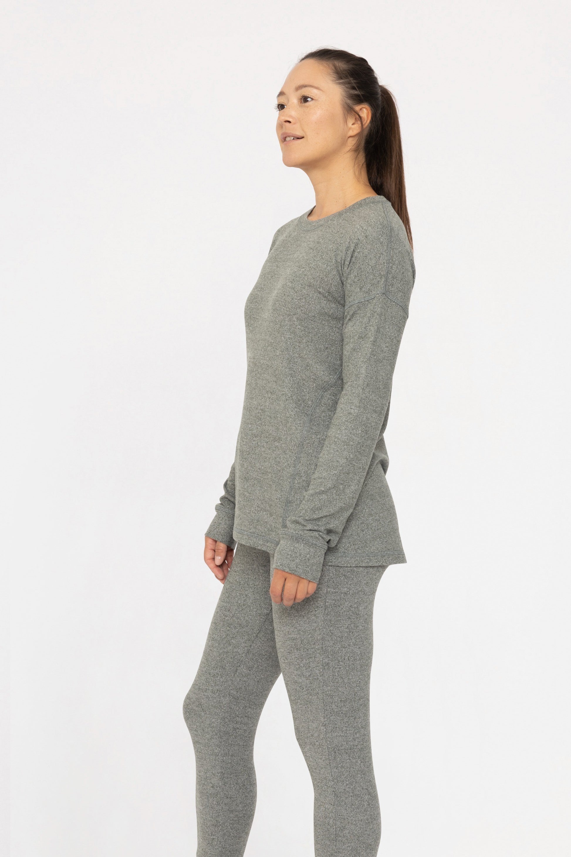 This long-sleeved top has an all-over brushed feel for the ultimate comfort. It features a crew neckline, dropped sleeves, a low yoke on the back, and a relaxed, long-line silhouette. 95% polyester, 5% spandex