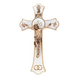 - Lead-free pewter corpus with gold finish and white pearlized epoxy inlay